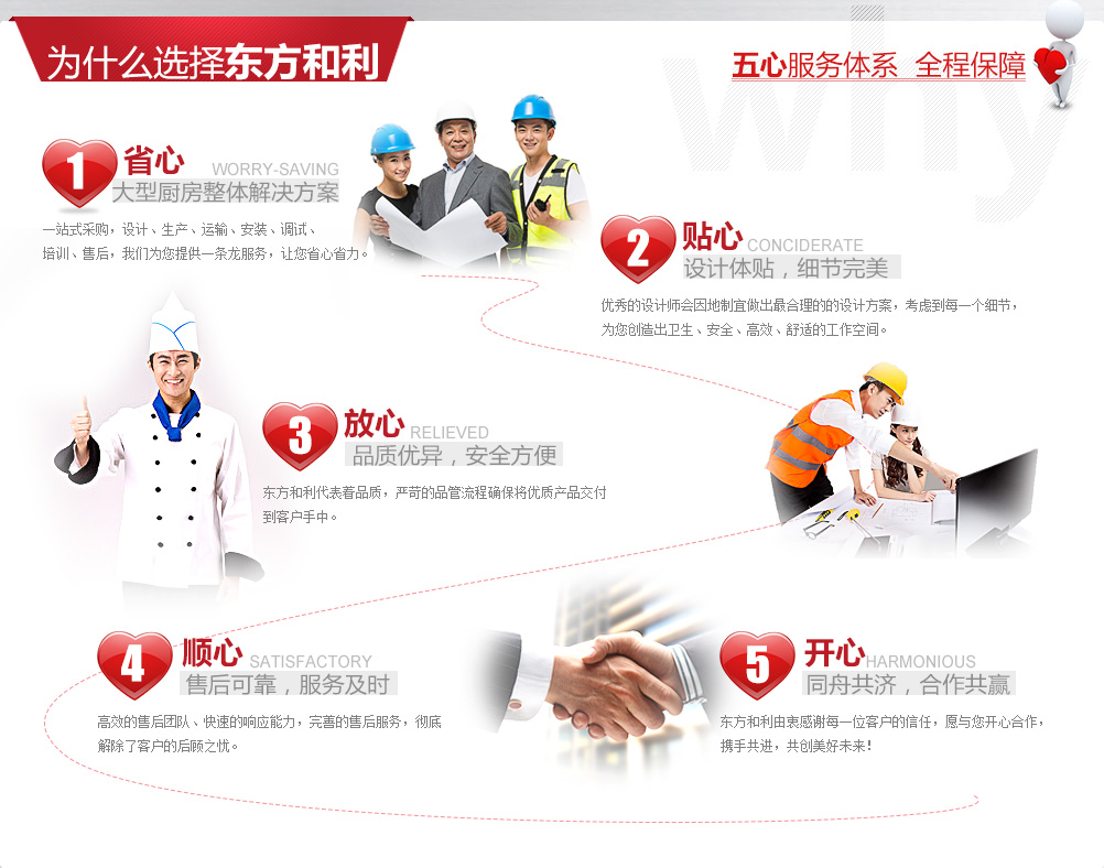 廚房工程建設是一項龐大復雜的系統工程,既需要與后勤工作人員、廚師溝通協調, 又要與土建、裝修、機電、暖通等工程人員相互配合,工作量十分巨大。同時還要采購眾多的食品機械、工具,這對沒有相關經驗的我們來說確實是一個挑戰。有時候我們面對廚師提出的長長的采購需求清單就已經眼花繚亂了。 幸好東方和利提供的是整體解決方案,從前期的設計咨詢到后期的安裝調試、從大型設備到餐具小件,包括各種食品機械,排煙通風,這些瑣碎事情都由東方和利來完成,為我們提供量身定制的解決方案。一站式采購為我們節省了大量精力,而且所有廚具都由東方和利來保修,對我們來說也更加方便??傊瑬|方和利的服務讓我們非常省心,我很滿意。